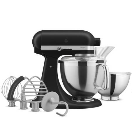 Artisan® Series 5 Quart Tilt-Head Stand Mixer with Premium Accessory Pack Model: KSM195PSBK Color: Imperial Black Model Includes: (1) 5 Quart Stainless Steel Bowl with Comfortable Handle, (1) 3...