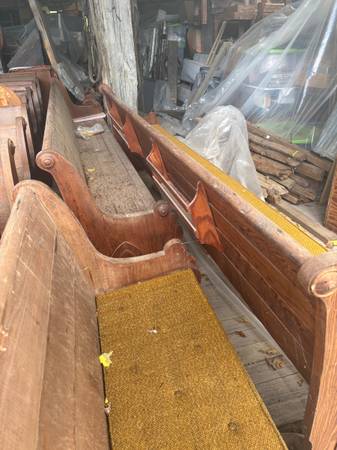 Hundred year-old oak custom church pews, good condition. Approximately 3 feet tall, 2 feet wide at widest point and 10 feet long. Comes with cushions. Thousand dollars each.