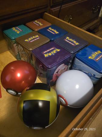 ***None come with cards, they are empty containers*** 3 pokeballs $3 each: ultra ball, pokeball, premier ball 7 tins $3 each: psychic, dragon, grass, water, steel, dark, fighting