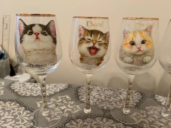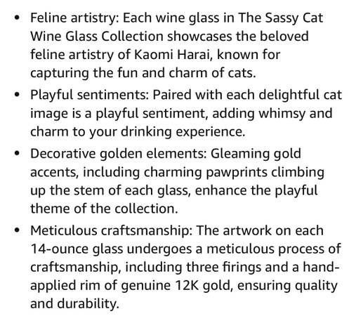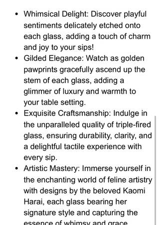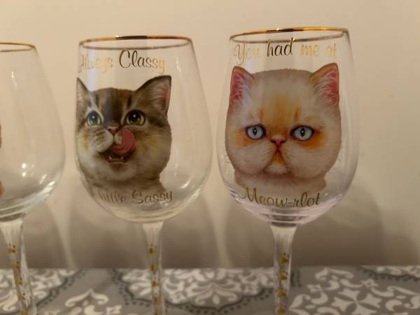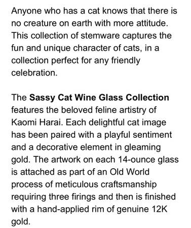 Purrfection & You had me at Meow-rlot by Kaomi Harai. Sold through Bradbury Exchange. Perfect condition 9" tall, 14 oz, wine glasses with 12 K gold rim. Do not have a certificate of...
