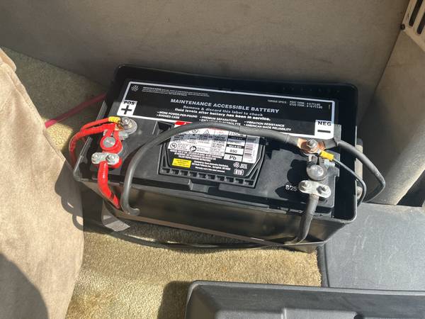 - Deep cycle interior battery installed, charged by an isolator near starting battery, powering some interior lights and an inverter to power 12v power outlets near back bench/bed;