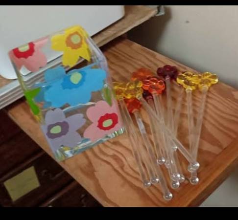 Square painted dish with stirrers & HEAVY Square vase ... $10 each