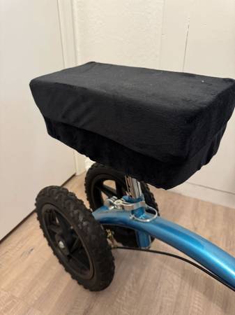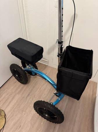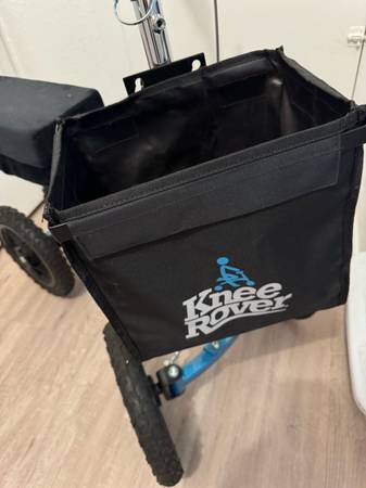 KneeRover All Terrain adult size knee scooter. Beautiful ! Used only a few times. Folds for transport 27 lbs includes Knee Rover deluxe carry basket and gel seat cover. Very stable on all types of terrain. Has handbrake and parking brake.