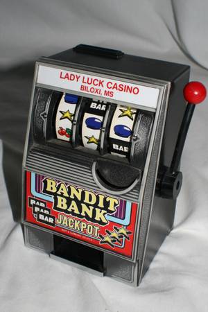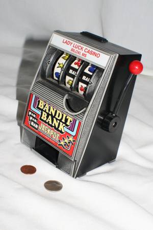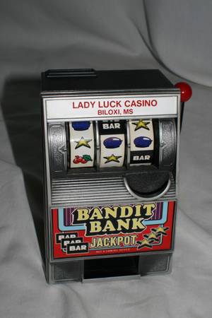 Very Neat.. Bandit Bank, from MS. Accepts coins for you to save ( top slot goes to the bank) or coins to gamble (front slot, you then pull the handle and you may win the jackpot! ( All the money...