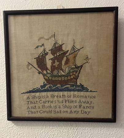 Vintage or antique framed cross stitch embroidery about books and reading! In original frame, dimensions are approximately 12.5" x 13" Pick up in the Target parking lot on Bosque in Waco, Tx. $20...