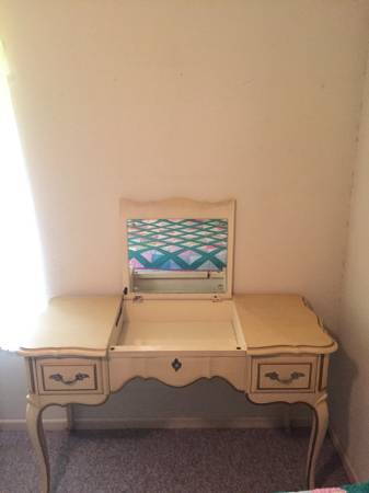 1960s French Provincial Make-Up Vanity/Console Table/Desk; antique white trimmed in gold; two drawers; mirror; 4'L x 20"W x 29 1/2"H.