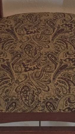 Wood chair; heavy; cherry finish; upholstered paisley seat; burgundy, dark green, tan; made for Ashley Furniture Industries; 40"H x 21"W x 18 1/2"D.