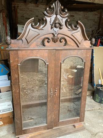 This beautiful two piece antique secretary desk is for sale. The ornate glass hutch will be set on top of the drop down desk to make a beautiful, useful addition to your home or office. It has some scratches but is generally in good shape. Needs some good polishing.