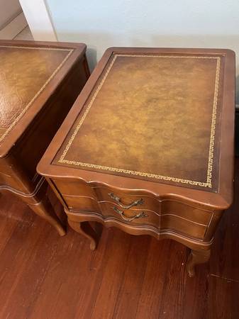 Here are 2 French Provincial bedside tables with leather top. There is some scuffing on the leg and slight wear overall, but in Nice condition. $180 for the pair. 24" tall 24 3/4" deep 19" wide