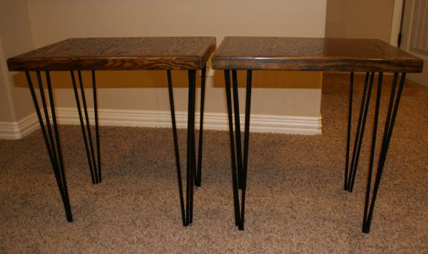 The tops are made from Cabinet Grade Oak plywood with solid Oak trim around them and they have metal hairpin legs.
