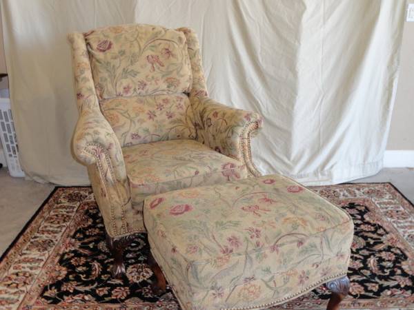 Queen Anne style wing backed chair with ottoman Flexsteel brand - quality inner workings Having to downsize. It needs a new home.