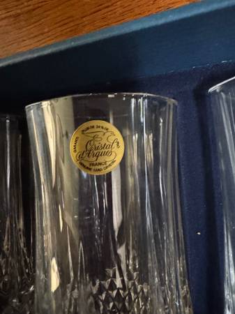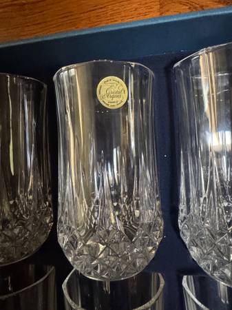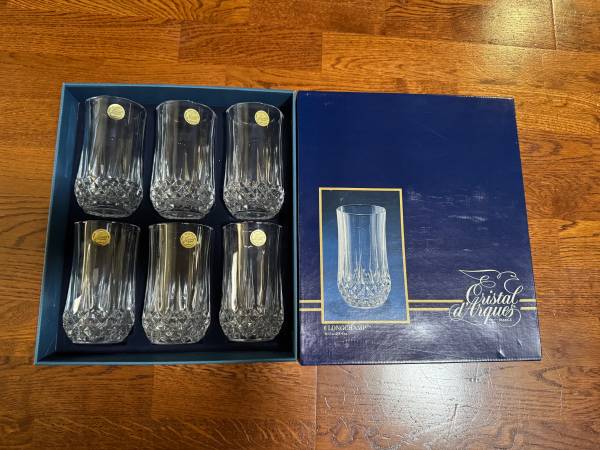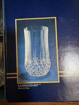 NEW in original box - 6 Vintage Cristal d'Arques Longchamp glasses - 12.75 oz/glass with original sticker - 5.25" tall each glass genuine lead crystal (I have 3 complete sets, all new with stickers...