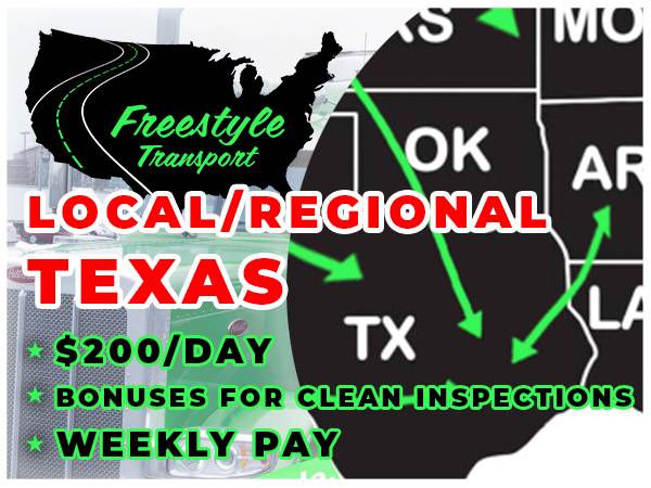 Freestyle Transport is looking for a local driver with Class A CDL. Pay is $200 per day. Driver would have to pick up and deliver local loads to and from our clients for OTR Team drivers. No set schedule, but most nights and weekends off and some days when we don’t have loads. Some regional runs to CO, OK, AR.